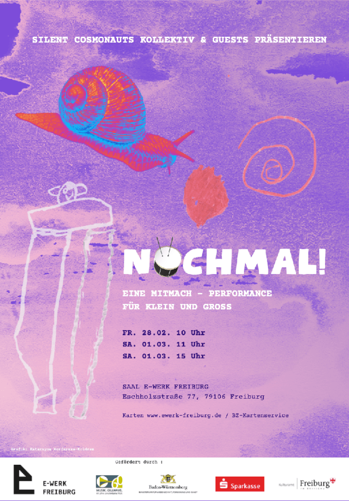 After a blissful premiere weekend in E-WERK Freiburg, November 2023 and 2 great guest performances of NOCHMAL! in Autumn 2024 in Art´Rhena and Karlsruhe, we gratefully bring back NOCHMAL! to stage in E-WERK FREIBURG, where we celebrated premiere in 2023,